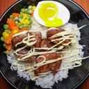 Rice in a bowl with toppings of boneless chicken thigh Japanese inspired fried chicken, buttered mix veggies & Japanese boiled egg ajitsuke tamago