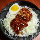 Rice in a bowl with toppings of boneless chicken thigh simmer with sweet savory taste of teriyaki sauce, coleslaw & Japanese boiled egg ajitsuke tamago