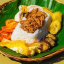 Rice platter of Chicken Pastil with Salted egg and Tomato,Scramble egg, fried talong, and sweet banana for dessert