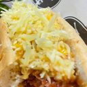 Cheesy Hungarian in a Bun with Grated Cheddar Cheese Toppings and Cheese Sauce and Mayo-Ketchup Drizzle