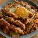 Stir-fried Kimchi & Rice topped with Egg & Pork Bulgogi.