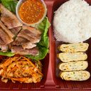 Samgyupsal with rice, dipping sauce & 2 side dishes of your choice.