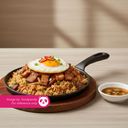 For reference: Sizzling rice dish topped with seasoned meat, onions, and spices, served with a tangy sauce.