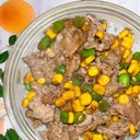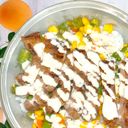 Plain rice, belly & buttered vegetable Drizzled with white sauce