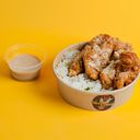Fried chicken poppers coated in flavorful sauce of your choice topped in rice