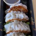 Japanese wonton wrapper with pork and veg. Steamed and grilled