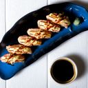 Egg thinly sliced into pieces served with Kikkoman and Wasabi