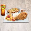 1 Crunchy Chicken with Rice, Cheesy Spaghetti, and 1 Pizza Slice w/ Drink