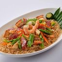 Fried rice with crab meat, egg and peas topped with fried garlic, onion leeks and carrot.