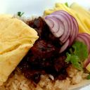 Our special bagoong fried rice is a combination of our signature sweetened pork, omellete, julienne cuts of green mango, red onions, and coriander. Mix them all together and enjoy.