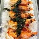 Fresh peeled 'Gambas' in garlicky butter sauce with a little bit of spicy and a crunch of basil on top, served over steamed rice
