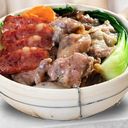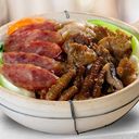 Marinated tender pork spareribs spread over rice, with Chinese Sausage, Bok Choy, and mushrooms, cooked on top of Jasmine Rice