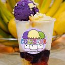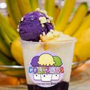 For reference: A colorful dessert with crushed ice, sweet beans, fruits, and creamy ube topping.