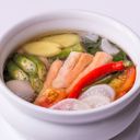 Be filled and contented by this oriental dish of fresh seafoods, a variety of vegetables and thick noodles in a creamy soup