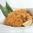 Fried rice sauteed in shrimp paste ,egg,chicken,shrimp,red chilli and green peas seasoned with dark soya.