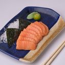 Raw Salmon thinly sliced into pieces served with Kikkoman and Wasabi