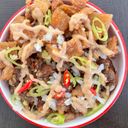 Crispy Bagnet Dinakdakan with onions, chilies, ginger, and tangy vinegar, topped with a creamy mayo sauce.