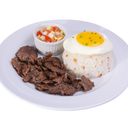 Specially marinated tender beef strips pan-fried short of crunchy, served with garlic or plain rice, fried egg and mango salsa