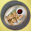 For reference: Crispy spring rolls filled with seasoned meat, served with rice and dipping sauce.