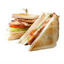 A hearty triple‑layer clubhouse with tender chicken, crispy bacon, ham, egg, fresh veggies, and toasted bread—classic, filling, and perfect with your favorite brew