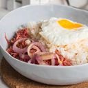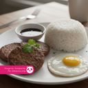 Pan-fried savory beefloaf paired with a fried egg & rice