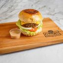 Quarter Pound Beef Pan-Grilled Patty Topped with Fresh Lettuce, Tomatoes, Onions, and Special In-House Sauce in a Soft Sesame Bun.