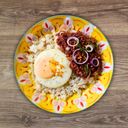 A meal composed of sweet preserved pork called tocino, rice, and fried egg.