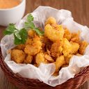 For reference: Bite-sized shrimp pieces, battered and fried to perfection, served with a dipping sauce.