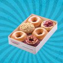 This Box of 6 Pre-Assorted Doughnuts comes with three (3) of our Original Glazed® Doughnuts and three (3) of our NEW Throwback Favorites Doughnuts