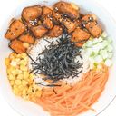 Salmon cubes in our special glaze, carrots, cucumber,corn, nori, rice