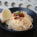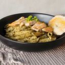 Spaghetti noodles served with a bold, nutty, and garlicky pesto sauce, topped with pan-grilled rosemary chicken