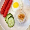 For reference: Savory chicken sausage served with garlic rice and a fried egg, a hearty breakfast.