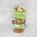 Avocado soft-serve ice cream layered with homemade cream, biscuits and pearls topped with avocado chunks, almond bits and a dash of chia and flax seeds