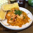 Flat noodle pasta in creamy aligue sauce topped with stir-fried shrimp