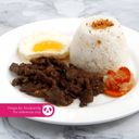 For reference: A hearty breakfast featuring garlic rice, fried egg, and marinated meat.