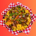 Overloaded Fries topped and coated with Jalapeno Nacho Cheese, Chopped Red Onions, Tomato Bits, and Cilantro. Topped with Nacho El Carne.