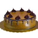 Round mocha cake with an icing combination of chocolate fudge and mocha bordering the sides
