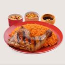Whole Charcoal Chicken served on a bed of flavorful Java rice, your choice of three (3) Solo Side Dishes with a liter of House-blend Iced Tea or Lime-ade, and your choice of Signature Sauces.