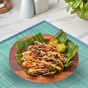 Filipino Rice Noodles smothered with seafood-infused sauce, topped with shrimps, tinapa, egg, mushroom chicharon and scallions.