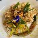 Wok fried handmade noodles, soy sinamak chili garlic sauce, 3 pc chick n shrimp siomai, fried egg, crispy onions and garlic, pao crumbs, spring onions