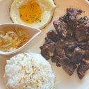 For reference: A Filipino breakfast featuring garlic rice, fried egg, and savory marinated meat.