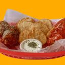 Boneless chix poppers tossed in Wingyard sauce paired with Mojos and dip