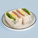 Bread , fluffy scrambled eggs, garden veggies , , ,smoked sausage and ham.