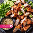 200g. Crispy deep-fried pork belly with golden crackling skin, tender meat inside & served with a flavorful dipping sauce
