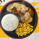 2-3 cuts of seasoned boneless chicken with creamy sauce, and rice topped with corn