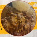Thinned Sliced Beef with onions, Rice, Topped with Corn and Parsley