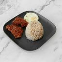For reference only: Tender and flavorful chicken served with rice and egg.