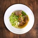 Beef soup topped with some Chinese cabbage, carrots, & spring onions