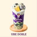 Ube ice shavings, ube, leche flan, macapuno, caramelized banana, red, green jellies, tapioca pearls, coconut jelly, corn, beans & rice crispies