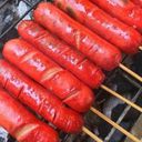 It's brushed with a savory-sweet sauce and often dipped in spicy vinegar or chili sauce, giving it a smoky, tangy, and slightly chewy bite.